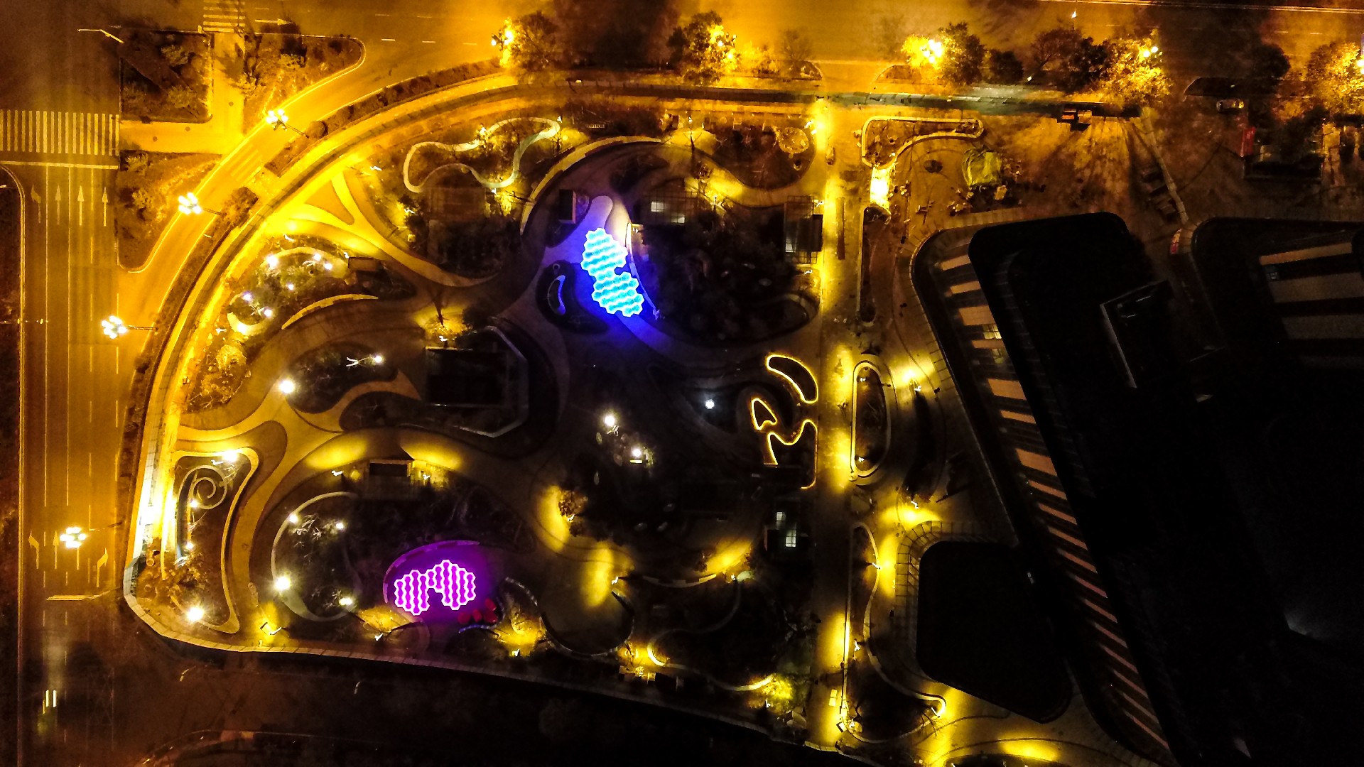 本案将不锈钢异形廊架和景观小品巧妙的结合起来